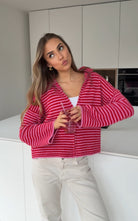 STRIPED ZIP KNIT CARDIGAN CHERRY
