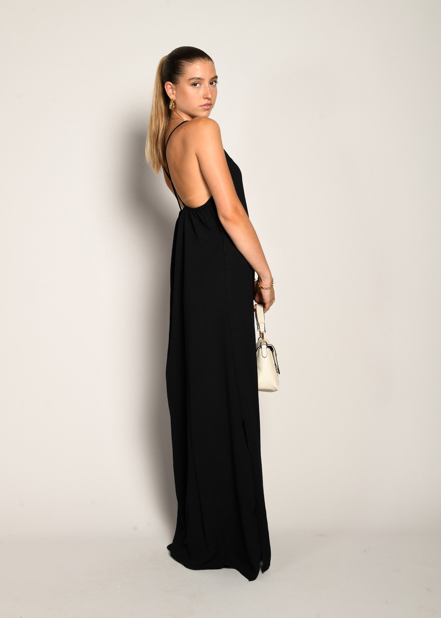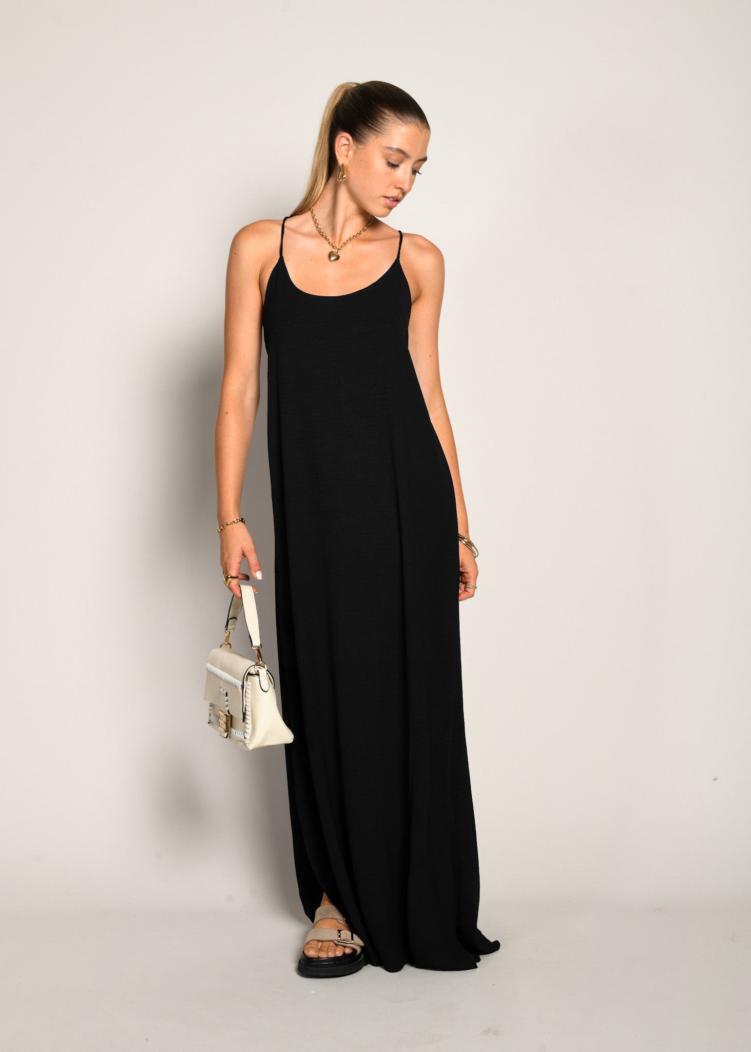ARTIKELDETAILS: Langes beiges Kleid mit dünnen Trägern.